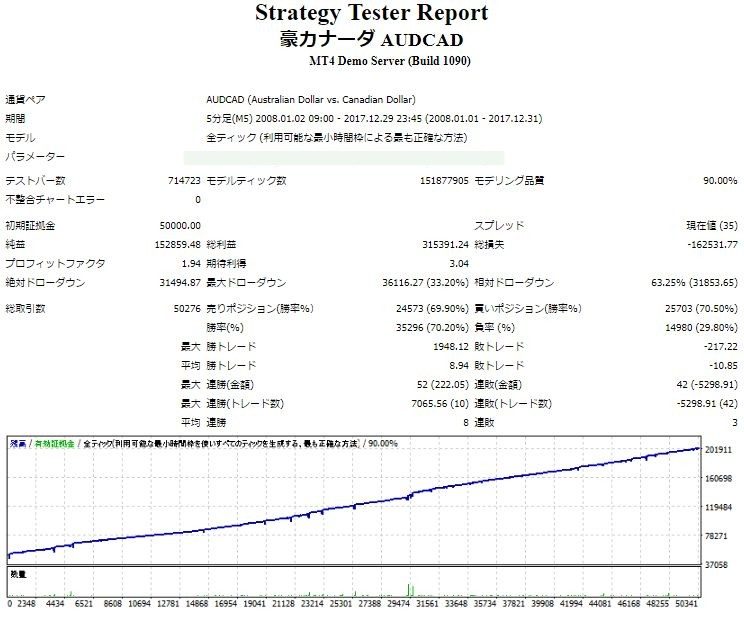 2008年1月~2017年12月まで10年間のAUD/CADのバックテストはこの様になります。