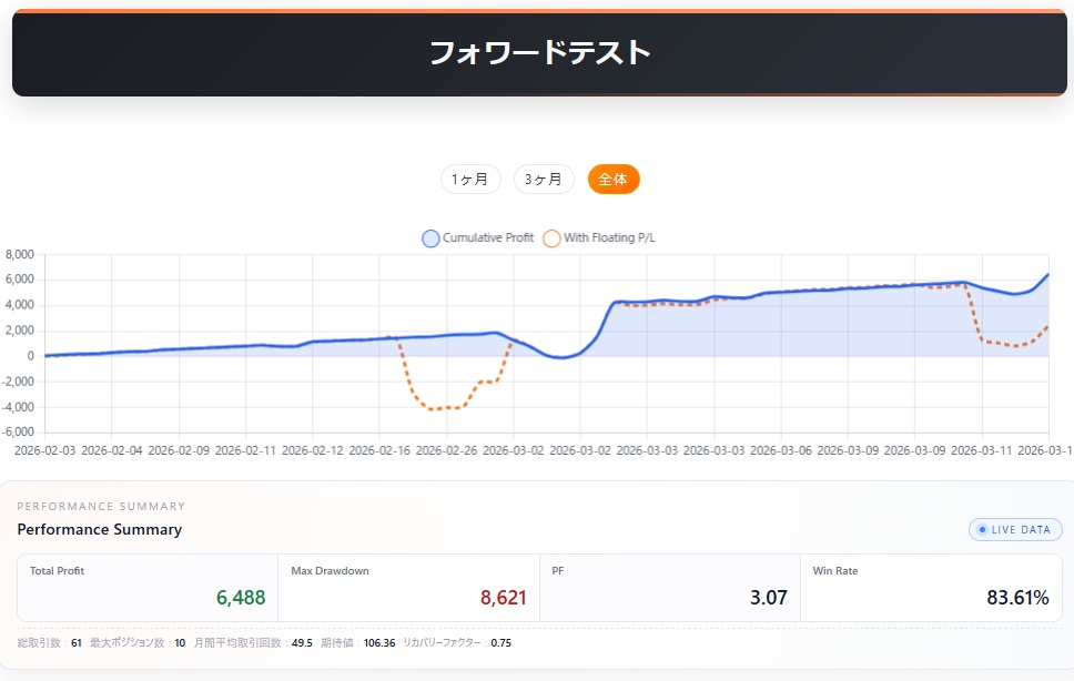 | 推奨証拠金 | 推奨証拠金:$5,000 USD 月利:1%% ※この情報は「0.01ロットで運用した場合の参考値」です。実際のロットサイズに応じて変動します。 |