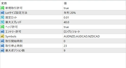 - シンボル:”AUDNZD,AUDCAD,NZDCAD” ※AUDCAD.aなどのサフィックスを使用している場合、パラメーターのシンボル名を更新する必要があります。