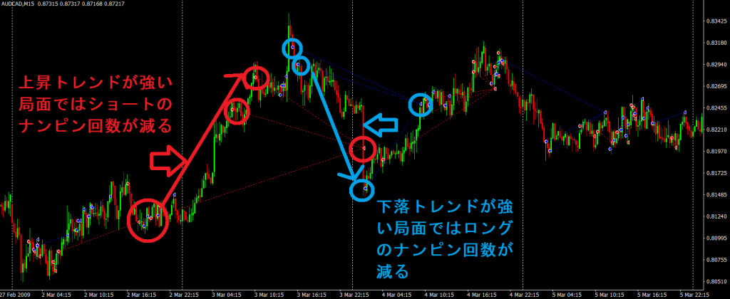 オートアジャスト機能は、ナンピン間隔が固定幅ではなく、保有したポジションの逆方向にトレンドが強い局面では間隔が広くなり、