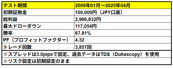 本EAは、この特性を活かし、複利で利益を積み重ねるように最適化されています。