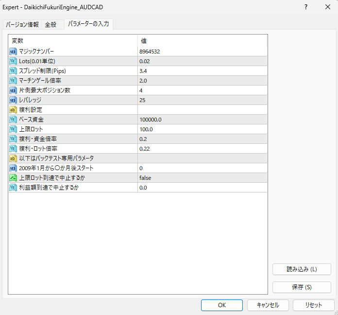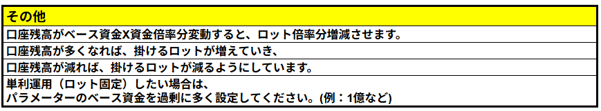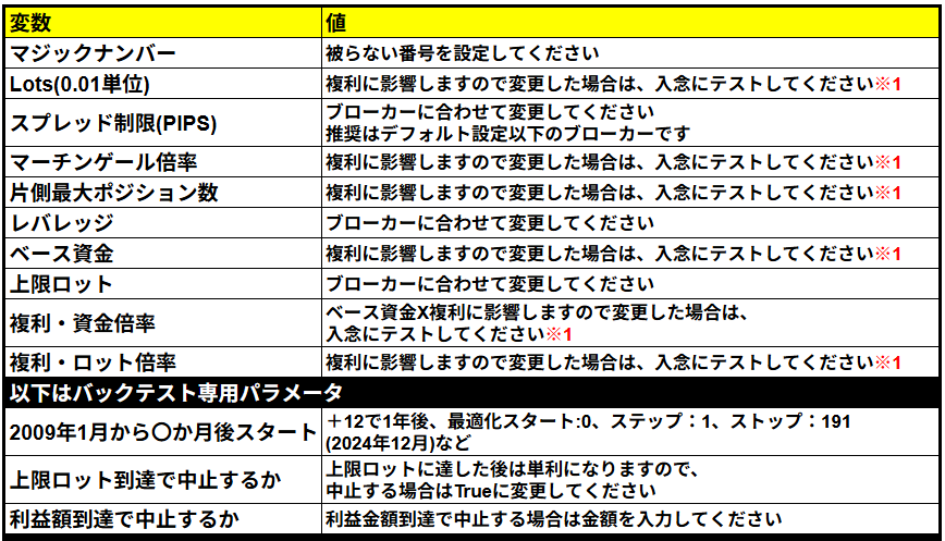 またロットや倍率を変更した場合は、バックテスト専用パラメータを使って入念にテストを行ってください。