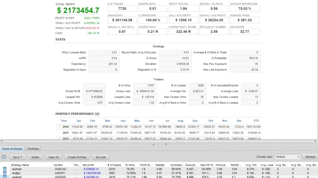 各通貨ペアの独立したエントリーフィルターに加え、共通のリスク管理エンジンとポジション監視システムにより、安定性と一貫性を確保。