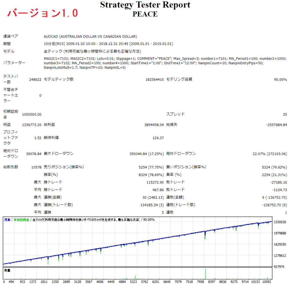 決済ロジックについてはバージョン1と同様になっておりますが、ナンピン間隔は独自の