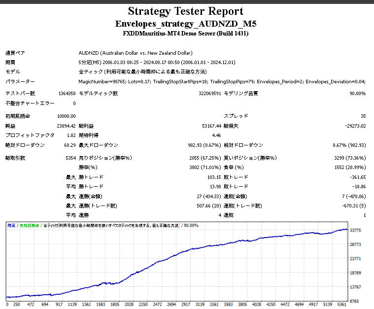 エンベーローブを使用したスキャルピング手法は定番ではありますが、このEAでは、AUD/NZDの通貨ペアの比較的剥離が起こりづらい傾向を利用して、その反発を取っていくことをコンセプトにしたEAです。