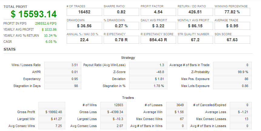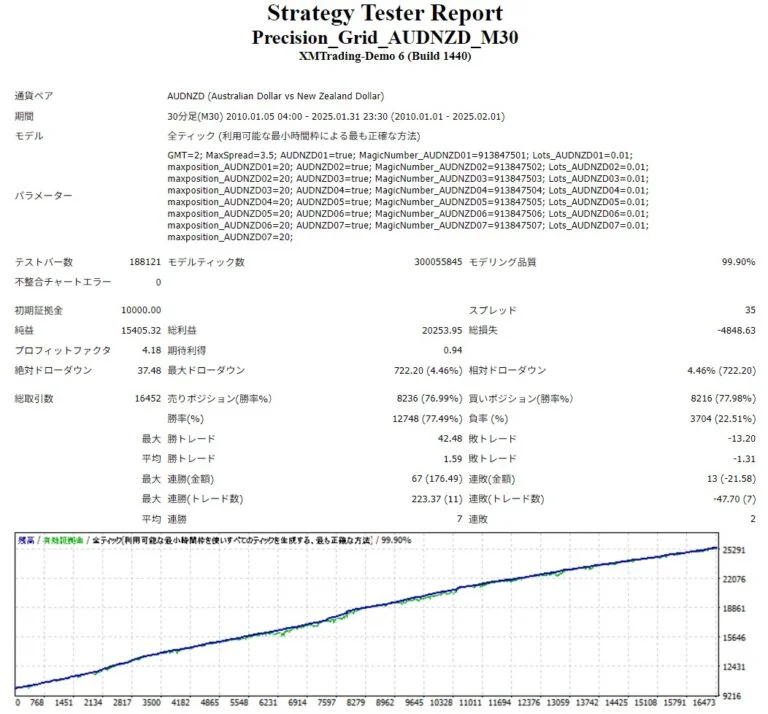 本EAは、2010年~2025年の約15年分のAUDNZD(M30)データにおいて、プロフィットファクタ4.18・勝率77.5%・最大ドローダウン4.46%という、極めて安定性の高い成績を記録しています。