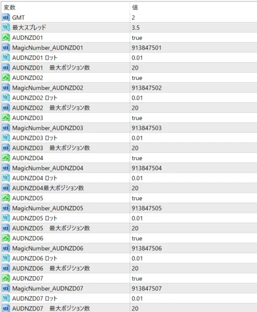 本EAでは、以下の項目をユーザーが任意に調整可能です。細かな最適化をせずとも、初期値のままで十分に安定した動作を実現しています。