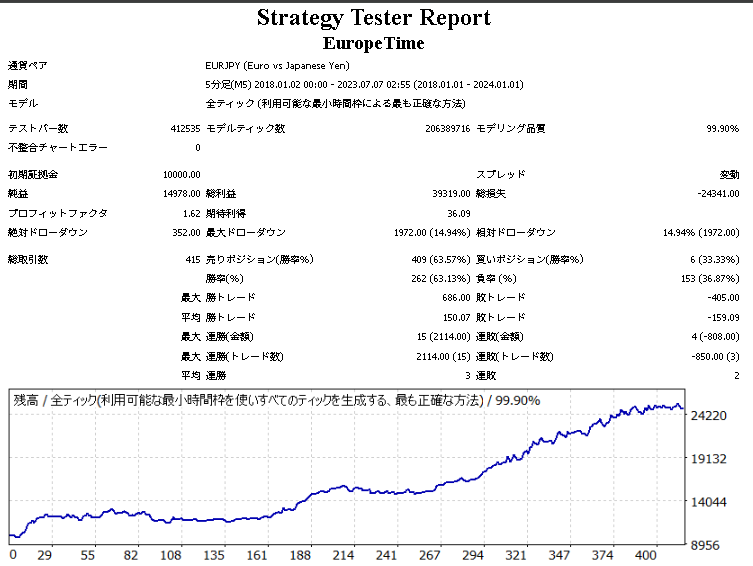 EURJPY(ユーロ円)×アノマリー×5分足「EuropeTime」 FX自動売買ツールEA