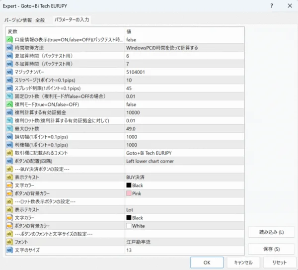 Goto+Bi Tech EURJPYのパラメーター