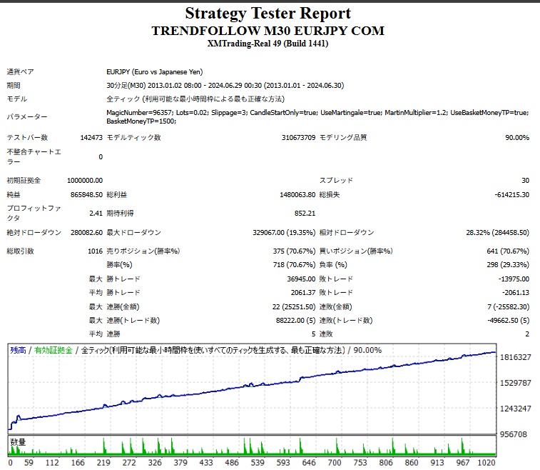EURJPY(ユーロ円)×ナンピンマーチン×30分足 TREND FOLLOW FX自動売買ツールEA