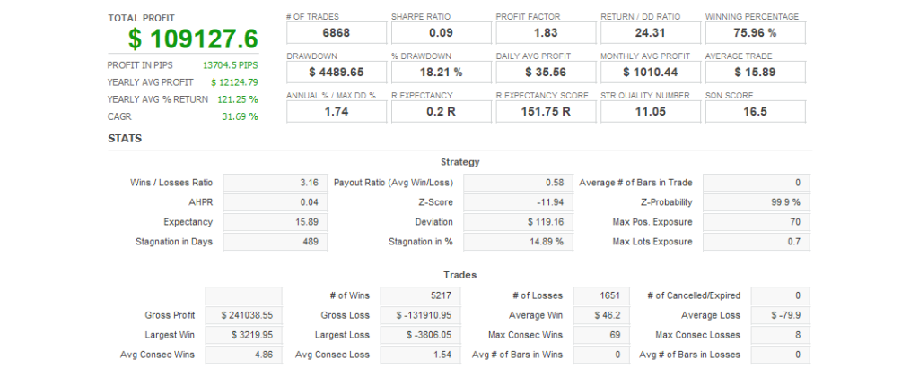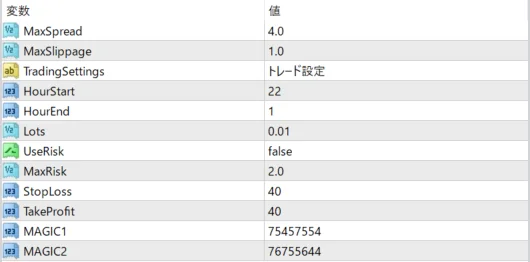 | 推奨証拠金 | $100 USD、月利:5% ※この情報は「0.01ロットで運用した場合の参考値」です。実際のロットサイズに応じて変動します。 |