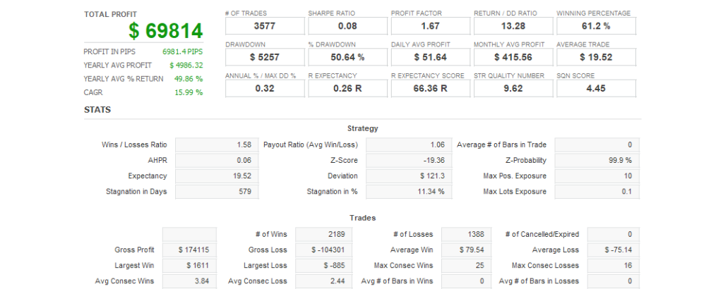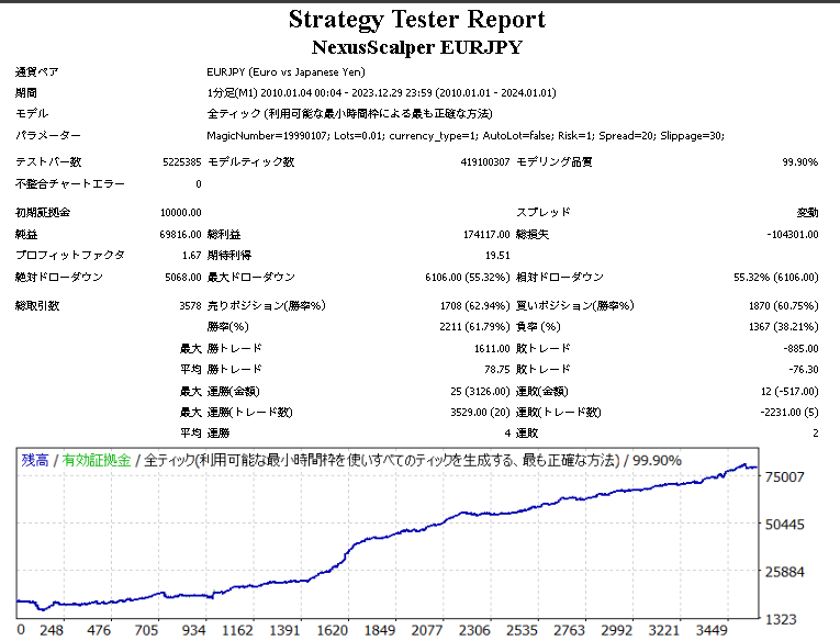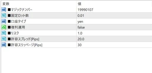 | 推奨証拠金 | $100 USD、月利:5% ※この情報は「0.01ロットで運用した場合の参考値」です。実際のロットサイズに応じて変動します。 |