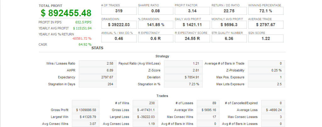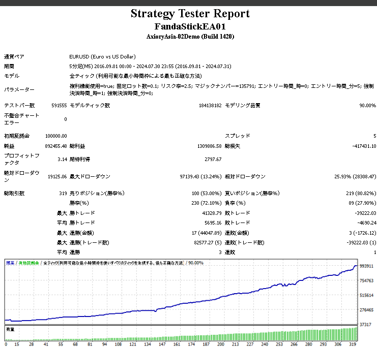 | 推奨証拠金 | $1,000 USD、月利:2.5% ※この情報は「0.01ロットで運用した場合の参考値」です。実際のロットサイズに応じて変動します。 |