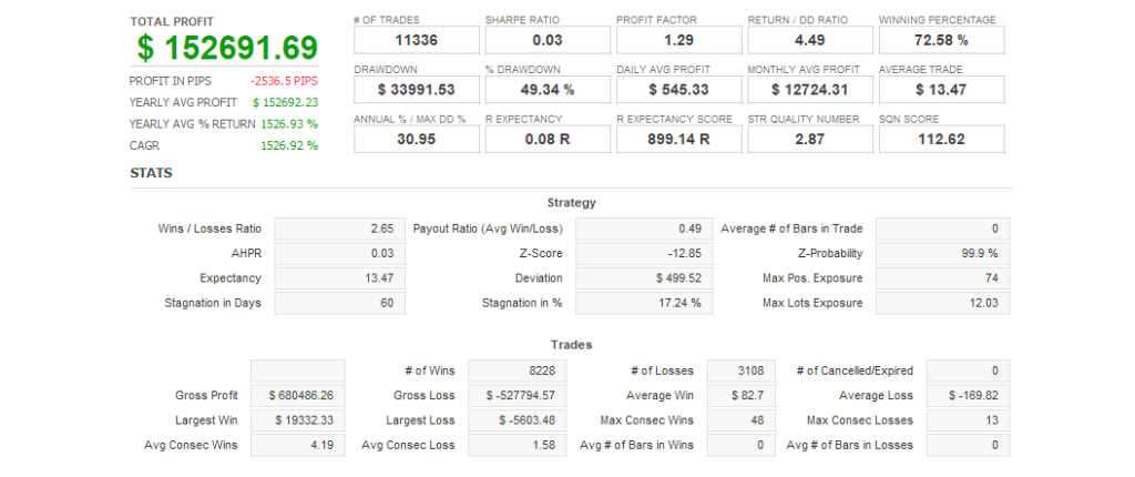 | 推奨証拠金 | $1,500 USD、月利:5% ※この情報は「0.01ロットで運用した場合の参考値」です。実際のロットサイズに応じて変動します。 |