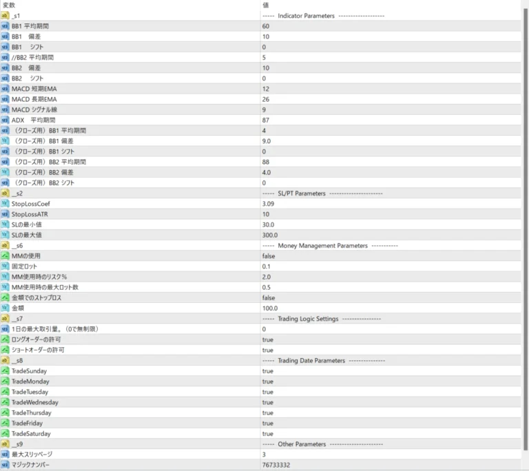 | 推奨証拠金 | $200 USD、月利:5% ※この情報は「0.01ロットで運用した場合の参考値」です。実際のロットサイズに応じて変動します。 |