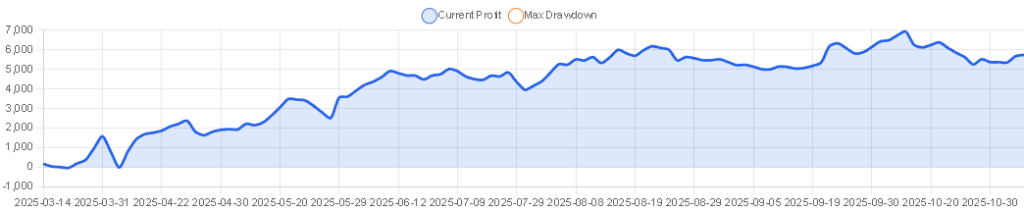 推奨証拠金$500 USD,月利:8% ※この情報は「0.01ロットで運用した場合の参考値」です。実際のロットサイズに応じて変動します。