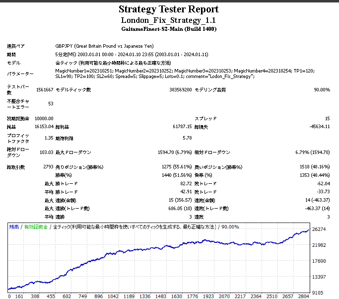 本EAについては、値動きが一番活発で値幅が取れるロンドン時間開始~ロンドンフィックスの時間帯にトレードを行い、一撃を狙っていくEAとなります。