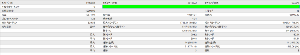 本EAの特徴として、EAによくありがちな一回の負けでひと月の利益が吹き飛んでしまう損大利小型ではなく、負けの被害をできるだけ小さくし、一撃を狙っていく損小利大型であること、また期待利得が4pips越えと大きいため、使用者が増え、多少の優位性が低下しても利益を上げることができる可能性が高いと考えております。