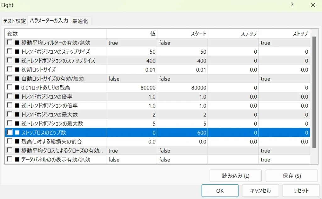 stepSizeCounterTrendPosition:逆トレンドポジションのステップサイズ(次の逆ポジションを取るために必要な価格変動の幅)を設定します。
