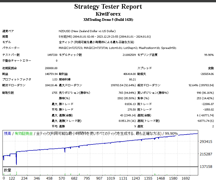 KiwiForexは過去20年間の市場データを元に、極限まで最適化されています。2004年から2023年までのバックテストで実証されたそのパフォーマンスは、確かな信頼の証です。