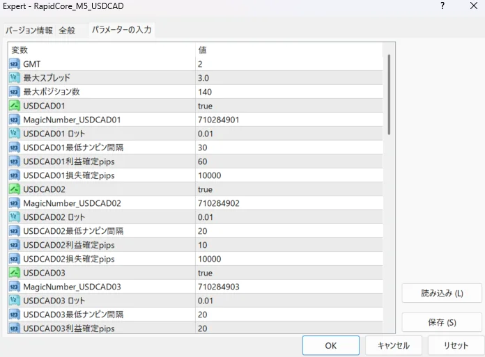 本EAでは、以下の項目をユーザーが任意に調整可能です。細かな最適化をせずとも、初期値のままで十分に安定した動作を実現しています。