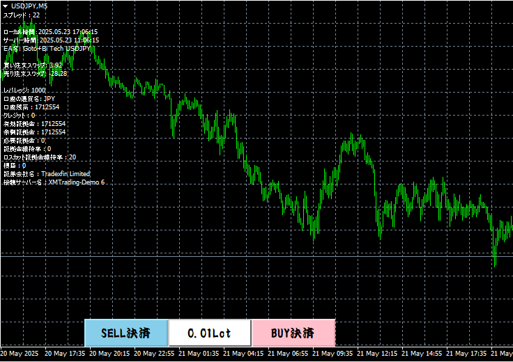 左下には設定された取引ロット数が表示されるボタンと、ワンクリックでポジションを手動決済できる決済ボタンが表示されます。