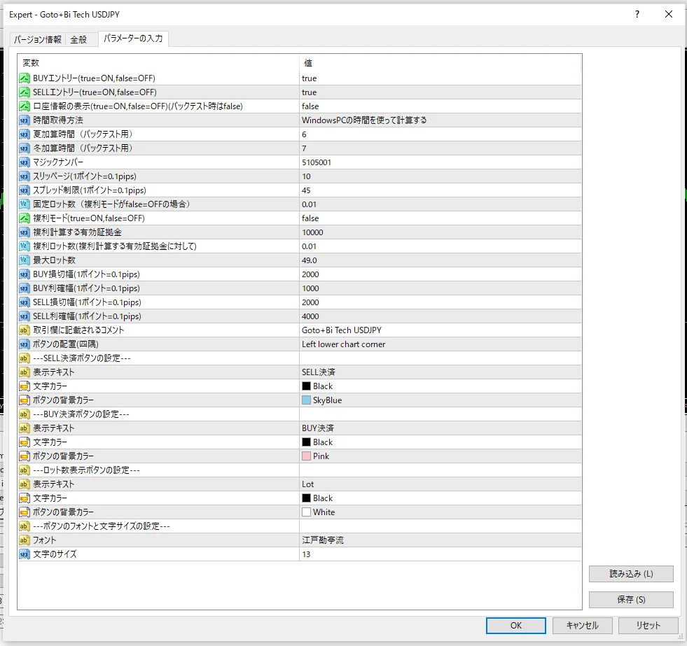 Goto+Bi Tech USDJPYのパラメーター