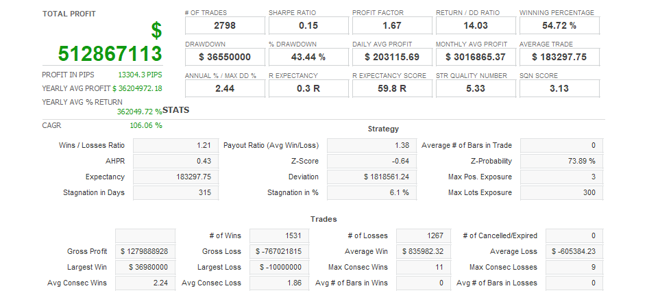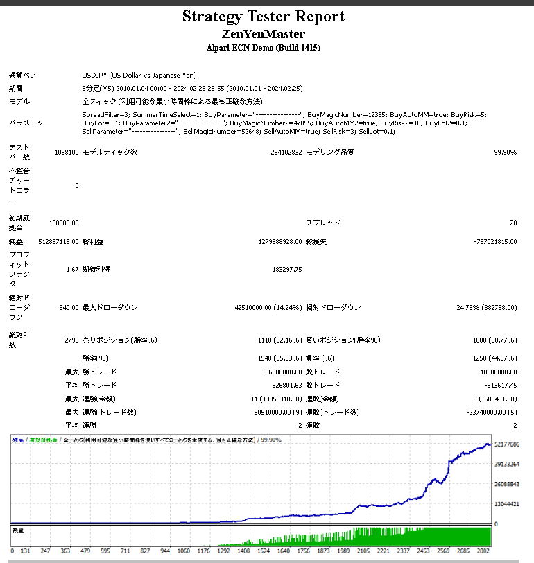 スプレッド2pipsの検証で14年間右肩上がりの成績、純益が5億1286万円、相対ドローダウンも24.73%とリスクも限定できています。