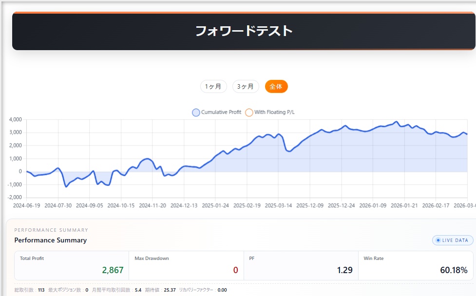 • クローズ条件:指定時間の決済に加え、RSI条件、利益到達、トレーリングストップ、ブレイクイーブン条件で決済します。スプレッドが悪化している場合は新規・決済を抑制します。