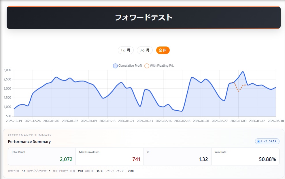 | 推奨証拠金 | 推奨証拠金:$50,000 USD 月利:2% ※この情報は「0.01ロットで運用した場合の参考値」です。実際のロットサイズに応じて変動します。 |