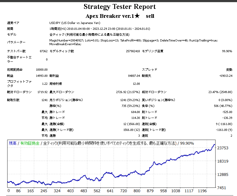 ※ Apex Breaker-sellは中期下降トレンドを捉える為、トレンドが無い場合、全く取り引きの無い期間が数ヶ月続きます、Apex Breaker-buyは長期上昇トレンドを捉える為にそれぞれのEAを同時に稼働させる事で空白期間を補完しあえます。