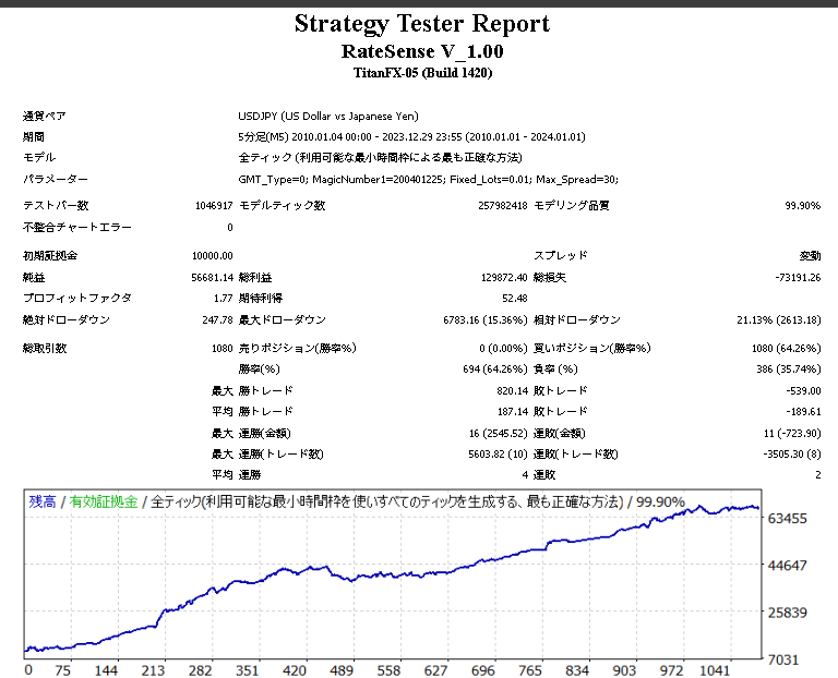 | 推奨証拠金 | $200 USD,月利:12% ※この情報は「0.01ロットで運用した場合の参考値」です。実際のロットサイズに応じて変動します。 |