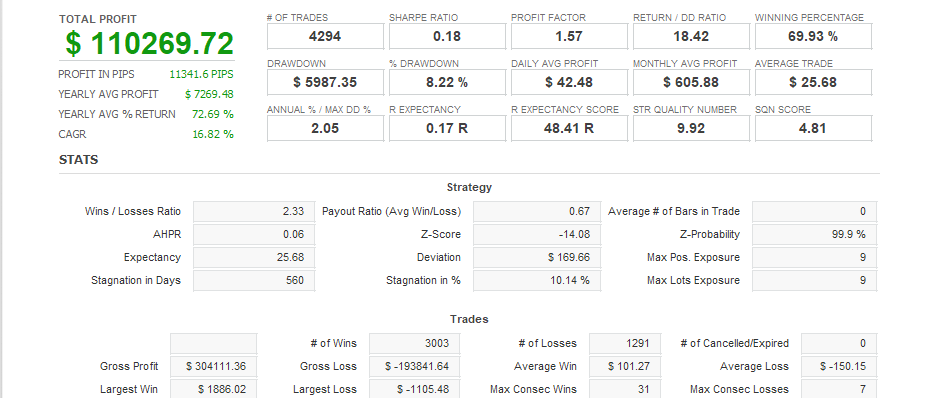 Tick Data Suiteを使用した15年に及ぶバックテストでは、4200回を超える取引で勝率は70%を超え、プロフィットファクターは1.57を記録し、非常に安定したトレードを実現しています。