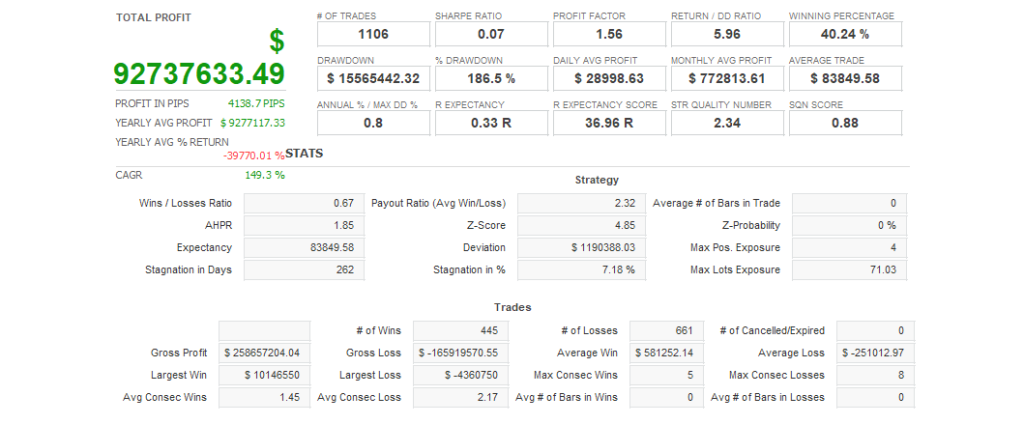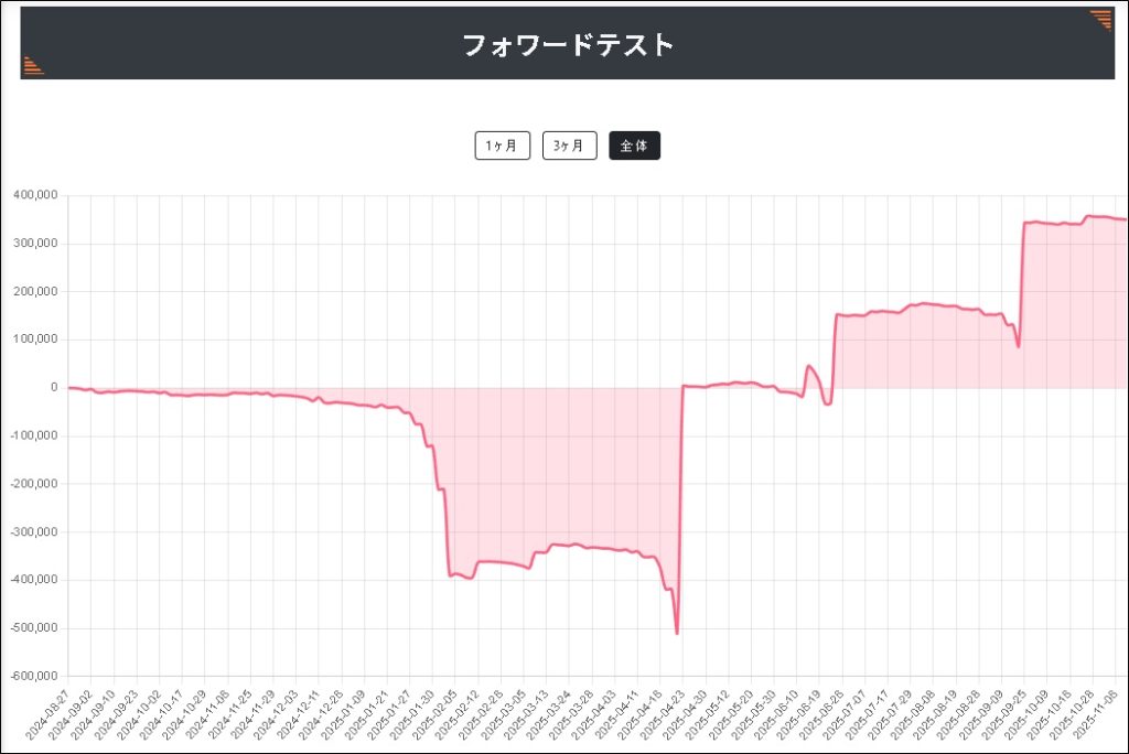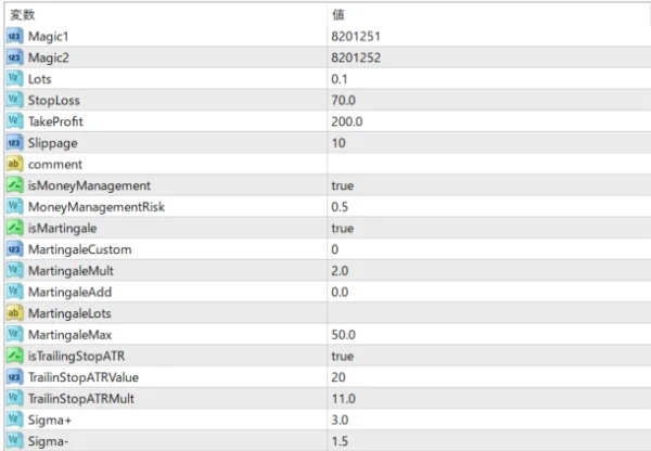 - 推奨証拠金:$1,000 USD、月利:70.3% ※この情報は「0.01ロットで運用した場合の参考値」です。実際のロットサイズに応じて変動します。