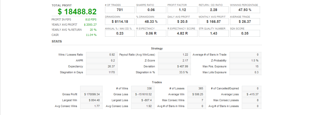 EURUSD15分用です。PF1.35、勝率は58.8%と低い数字ですが、損小利大としてトレンド相場できっちりと稼いでくれます。