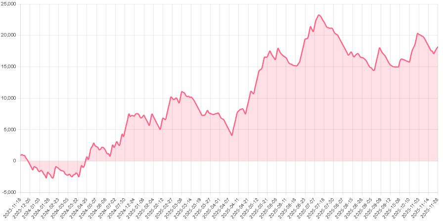 1999年からのバックテストにおいて、異常な低ボラティリティであった2019年の1年を除きすべて年間では勝ち越しており、直近のAI相場でパフォーマンスが著しく成績が落ちているということもなく、バランスの良い収支曲線の傾きとなっております。