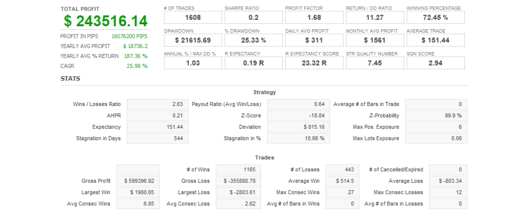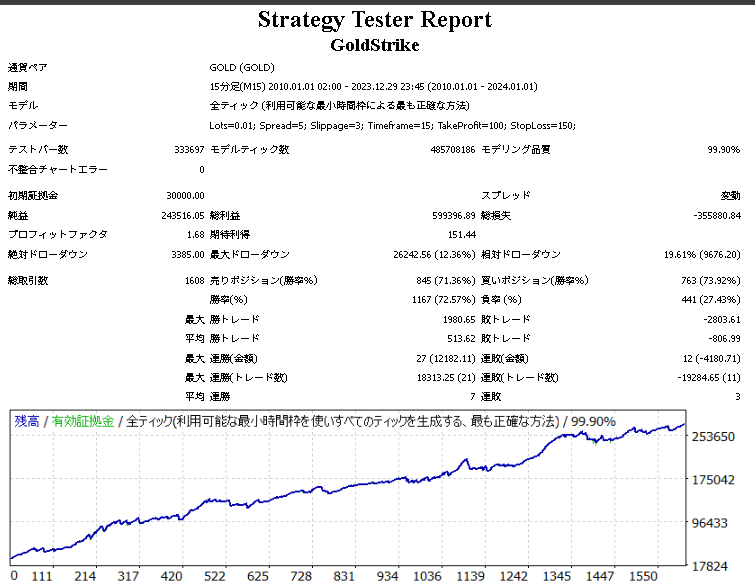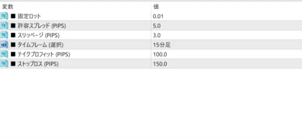| 推奨証拠金 | $1,000 USD、月利:5% ※この情報は「0.01ロットで運用した場合の参考値」です。実際のロットサイズに応じて変動します。 |