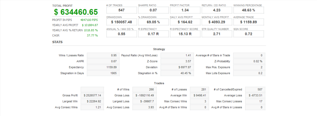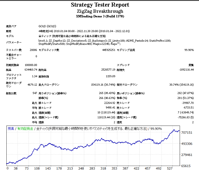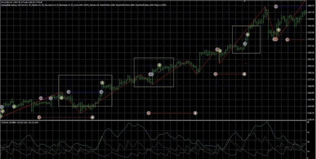 - エントリー条件:ZigZagインジケーターのゴールデンクロス(+DIと-DIのクロス)がロング注文のエントリーシグナル ZigZagインジケーターのデッドクロス(+DIと-DIのクロス)がショート注文のエントリーシグナル 未決注文は前のZigZagの高値と安値に配置される